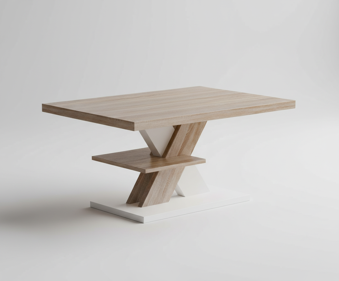 De salontafel is vervaardigd uit duurzame houtmaterialen met een witte en eiken afwerking, wat zorgt voor een langdurige en stijlvolle uitstraling.