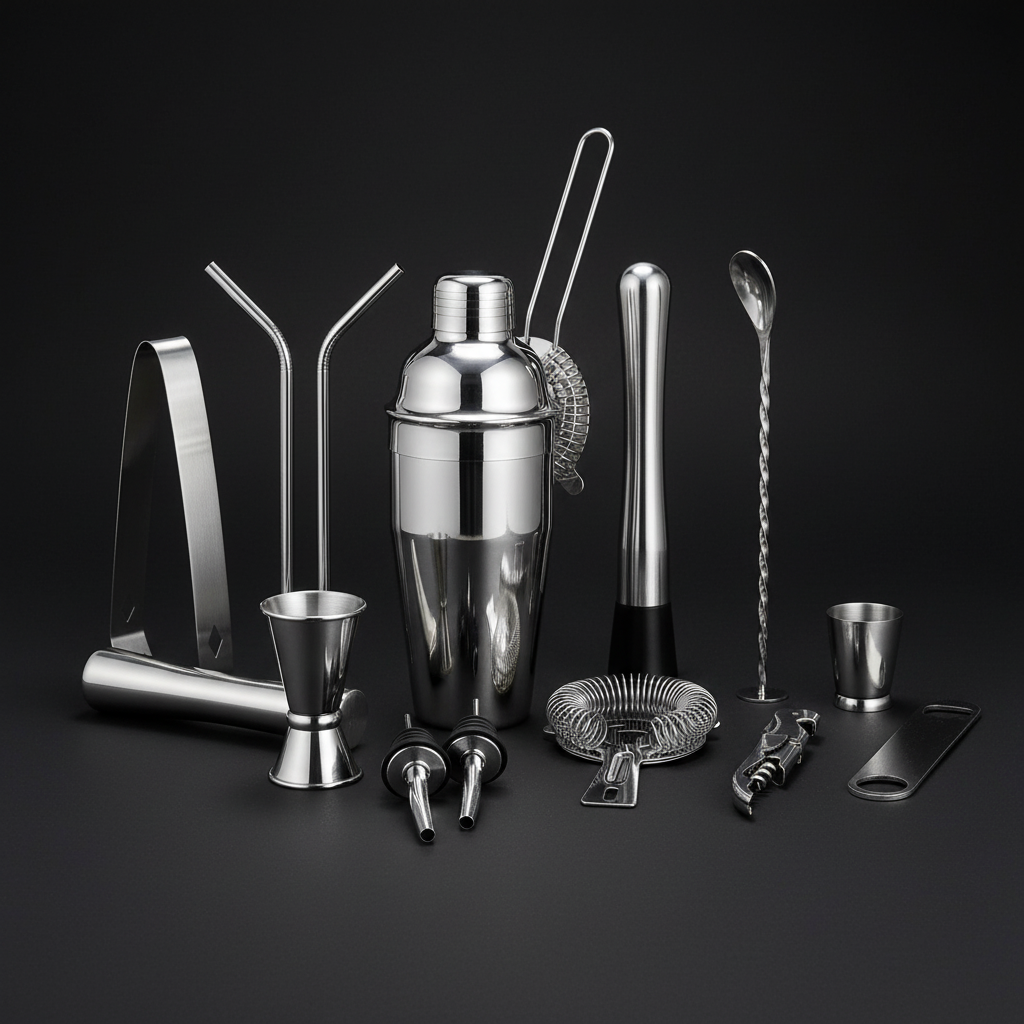 De set bevat 15 essentiële baraccessoires, perfect voor het maken van een breed scala aan cocktails.